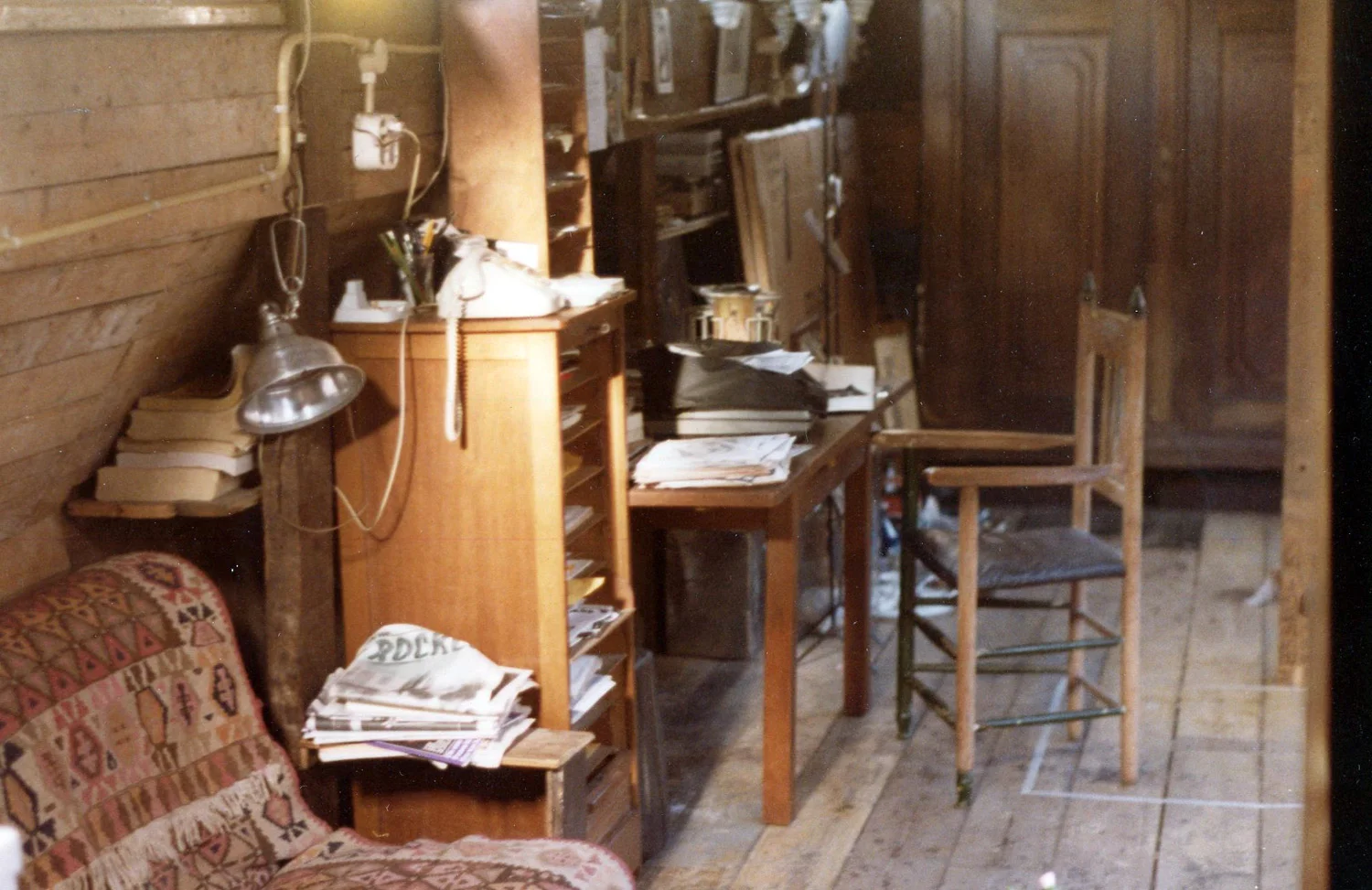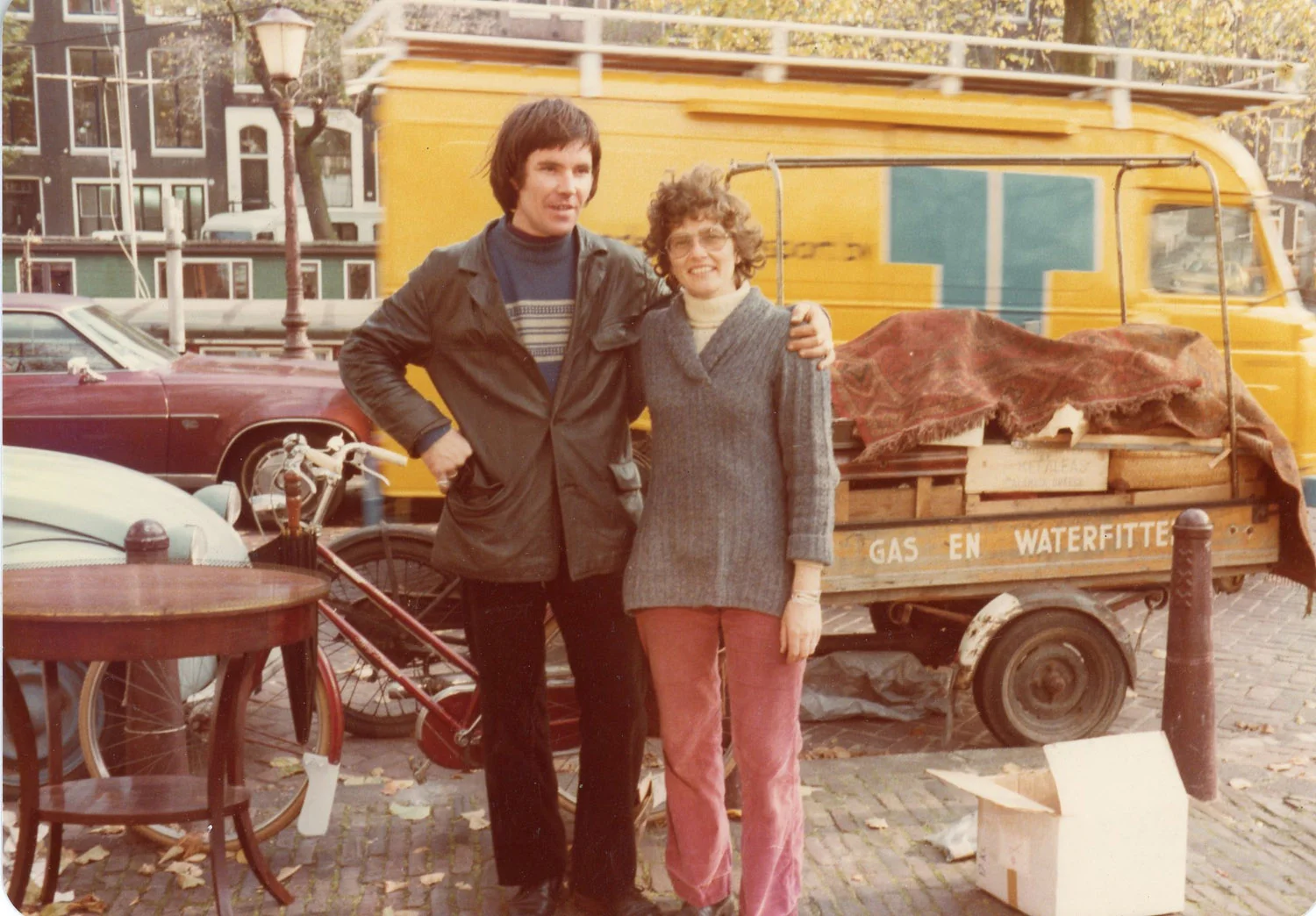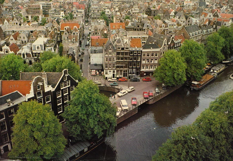 In Spring 1979 Bettie Ringma and I relocated from the loft on the Bowery to a houseboat in Amsterdam. Bettie grew up in the Netherlands and was eager to reestablish a Dutch residence. From her small savings she purchased the boat, sight unseen, from her less than reputable brother-in-law. It was a long flatboat minimally modified for living. The ceilings were so low that we often had to stoop, it was cold, and in such disrepair that it sank just a few years later. But it was ideally docked on the Prinsengracht directly opposite the Anne Frank house in one of Amsterdam’s most picturesque areas. I am still amazed by the birds eye photograph taken from the church tower of the nearby Westerkerk showing the boat in its Jordaan neighborhood.
